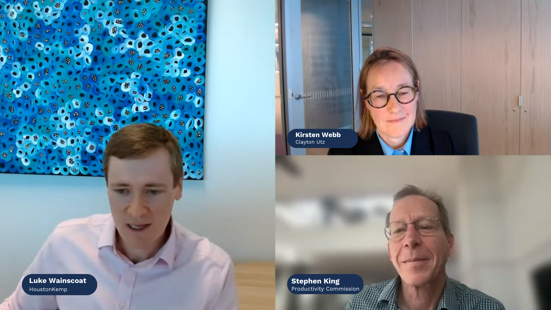 Moderated by Kirsten Webb, Partner at Clayton Utz, the session included Stephen King, Commissioner at the Productivity Commission and Luke Wainscoat, Senior Economist at Houston Kemp. The webinar was supported by Amazon.